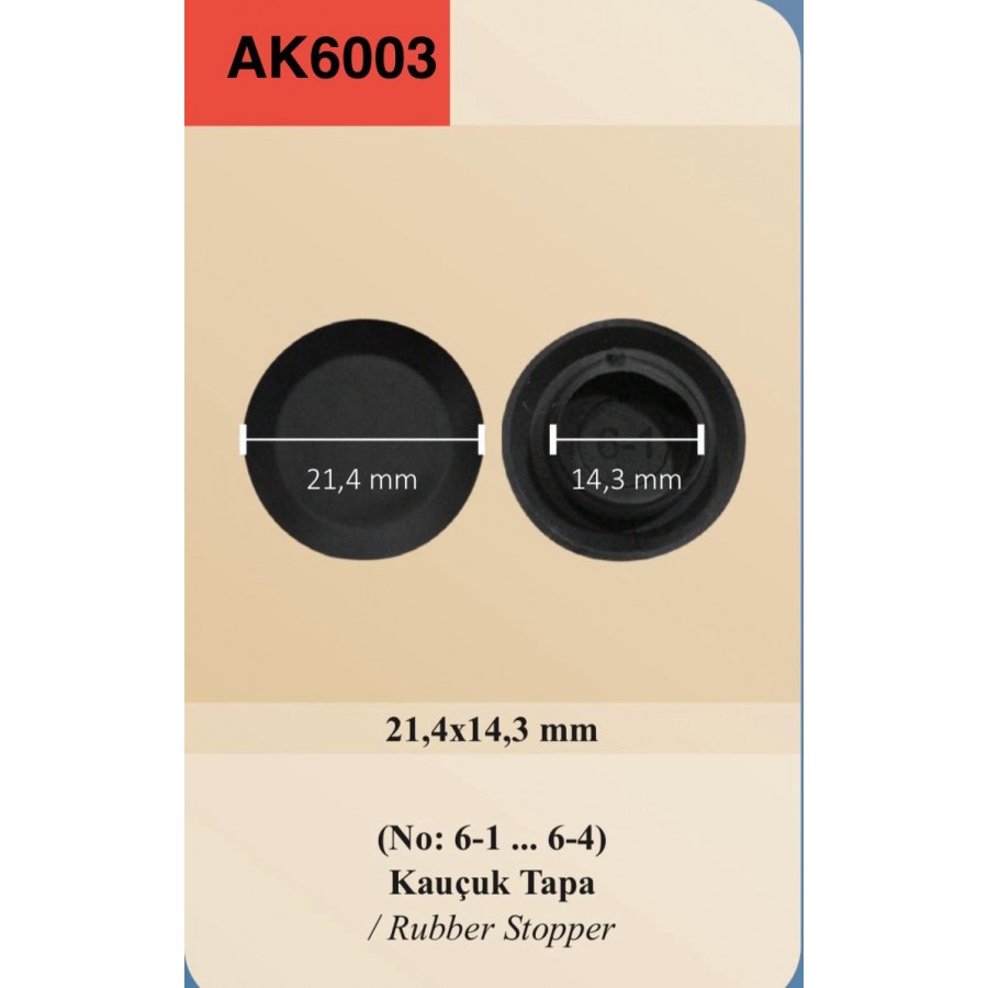 Kauçuk tapa No: 6-1 / 6-4 (21,4 × 14,3 mm), araç gövdesi ve endüstriyel yüzeylerde bulunan açık deliklerin kapatılması amacıyla kullanılan dayanıklı bir yalıtım parçasıdır. Su, toz ve kir girişini engelleyerek kaporta ve metal aksamın korunmasına yardımcı olur.